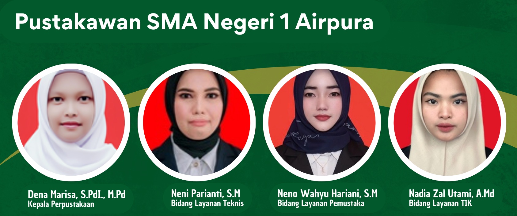 Nama : Perpustakaan Sekolah SMAN 1 Airpura NPP : 1301011E1000004 Akreditasi : Belum terakreditasi Alamat : Jl. Hilalang Panjang Kec Airpura Kab Pesisir Selatan Prov Sumatera Barat Kode Pos 25671 Kepala Perpustakaan : Dena Marisa, S.Pd.I., M.Pd |